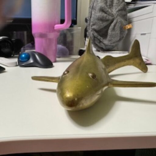 I had a sports reporter who was bemoaning the fact that it was so hard to write a fiction novel, let alone get it published, tell me I couldn’t do it. He came to this conclusion because I was a business writer and my degree was in business not any writing type degree. I was infuriated and was complaining later to my husband telling him that a writer writes. It shouldn’t matter what the writing was about. Dude, I took minutes at municipal meetings. If that isn’t creative writing, then I don’t know what is. I then picked up a brass shark I found at the house we moved into and said, “I should be able to write a story about this shark.” My husband being a wise person said, “Okay, do it.” I haven’t looked back. I still have the shark.